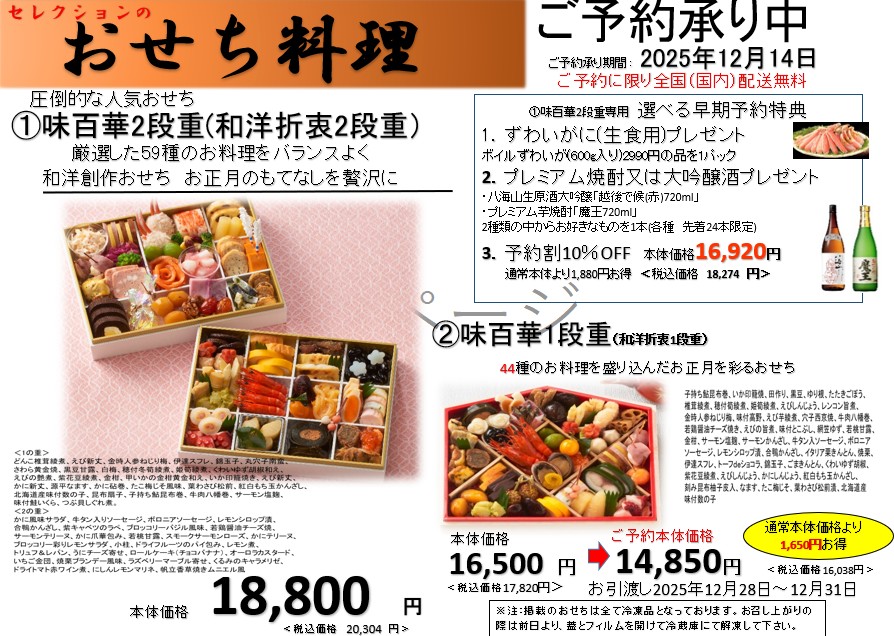 今年は味百華2段重専用の選べる早期予約特典